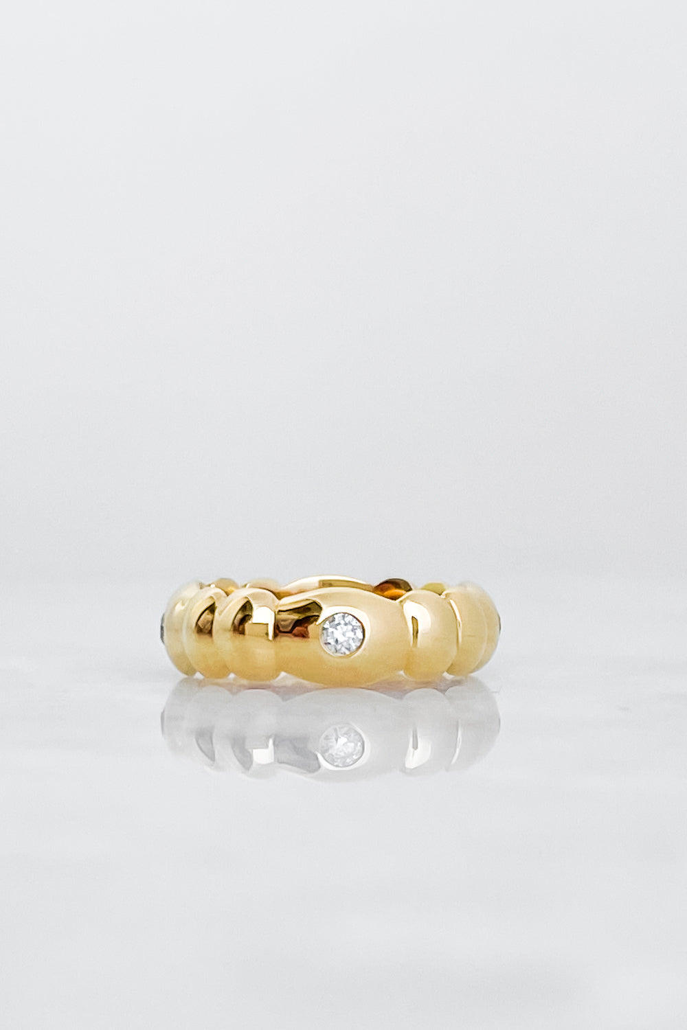 • Band is adorned with four round white diamonds, burnish set